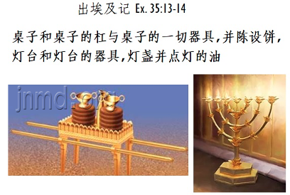 接下来是圣所里的“桌子和桌子的杠与桌子的一切器具,并陈设饼,灯台和灯台的器具,灯盏并点灯的油” (35:13-14)