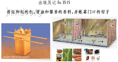 再来就是“香坛和坛的杠,膏油和馨香的香料,并帐幕门口的帘子" (35:15)