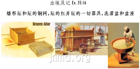 然后是在外院的“燔祭坛和坛的铜网,坛的杠并坛的一切器具,洗濯盆和盆座” (35:16)