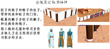 最后宣布的是“院子的帷子和帷子的柱子,带卯的座和院子的门帘,帐幕的橛子并院子的橛子,和这两处的绳子,精工做的礼服和祭司亚伦并他儿子在圣所用以供祭司职分的圣衣。”(35:17-19)