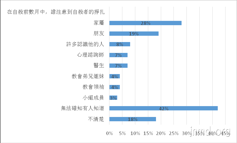 就如上面第二个图表所显示的,在有家人自杀身亡后的亲属中的调查发现,在死者生前竟然只有4%的会友或牧师注意到他的挣扎与需要,这真是个莫大的讽刺。