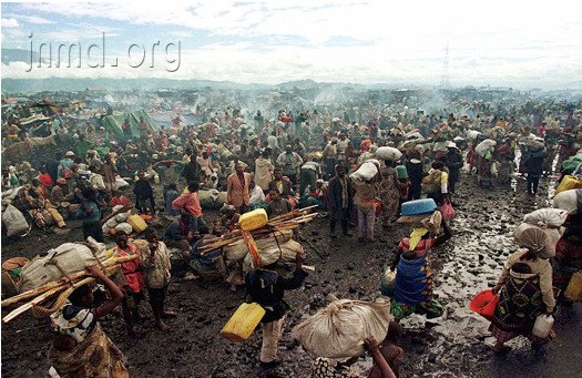 在一处叫鲁泰尔的地方,在首都以北十五英里。首都仍由胡图族政府军所控制,那里的图西族人难逃厄运,逃出来的全部挤到鲁泰尔附近山区。一个几百码宽、两三英里长的山头上,聚集了近六万多人,短短十日之内增至十万。大部分人都没有栖身之所。路上可以听见远处的炮火声,看见首都基加利上空的烟雾良久不散。我蓦然明白为什么我们不能进入坦桑尼亚,因为这边千千万万挣扎求存的人更需要我们!